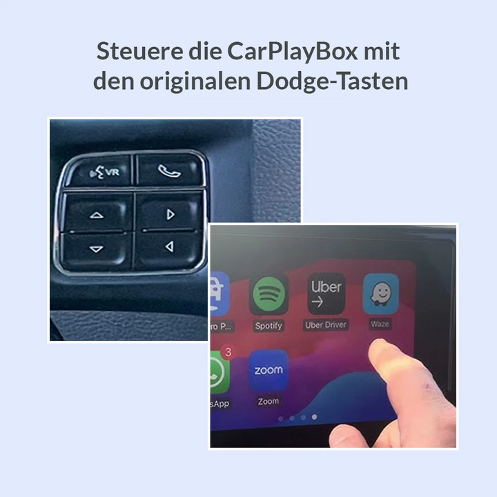 The CarplayBox from CarOptions integrates seamlessly with the infotainment system of your Dodge for Apple CarPlay, Android Auto.