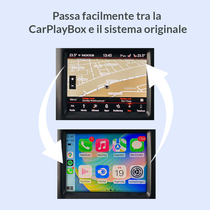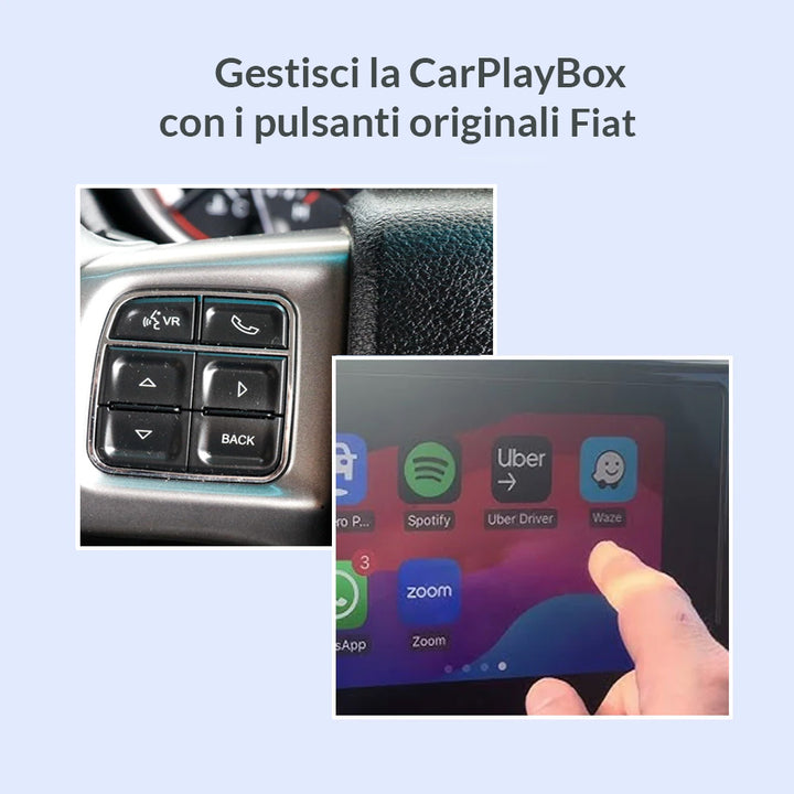 Control the CarPlayBox with the original controls of your Fiat. Switch between CarPlay, Android Auto, and your original system with the press of a button.