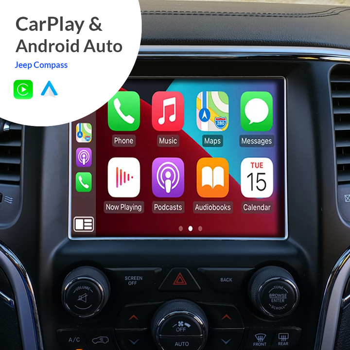 The CarplayBox from CarOptions integrates seamlessly with the infotainment system of your Jeep for Apple CarPlay, Android Auto.